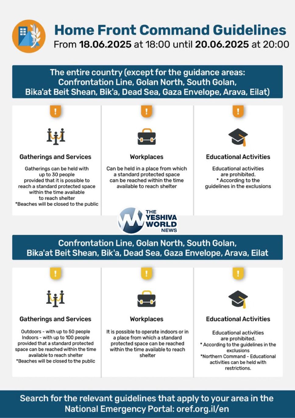 As part of the Home Front Command’s changes to its civil defense policy, small gatherings will now be permitted and workplaces will be able to operate provided an adequate shelter can be reached in time. Schools will remain closed nationwide until further notice.