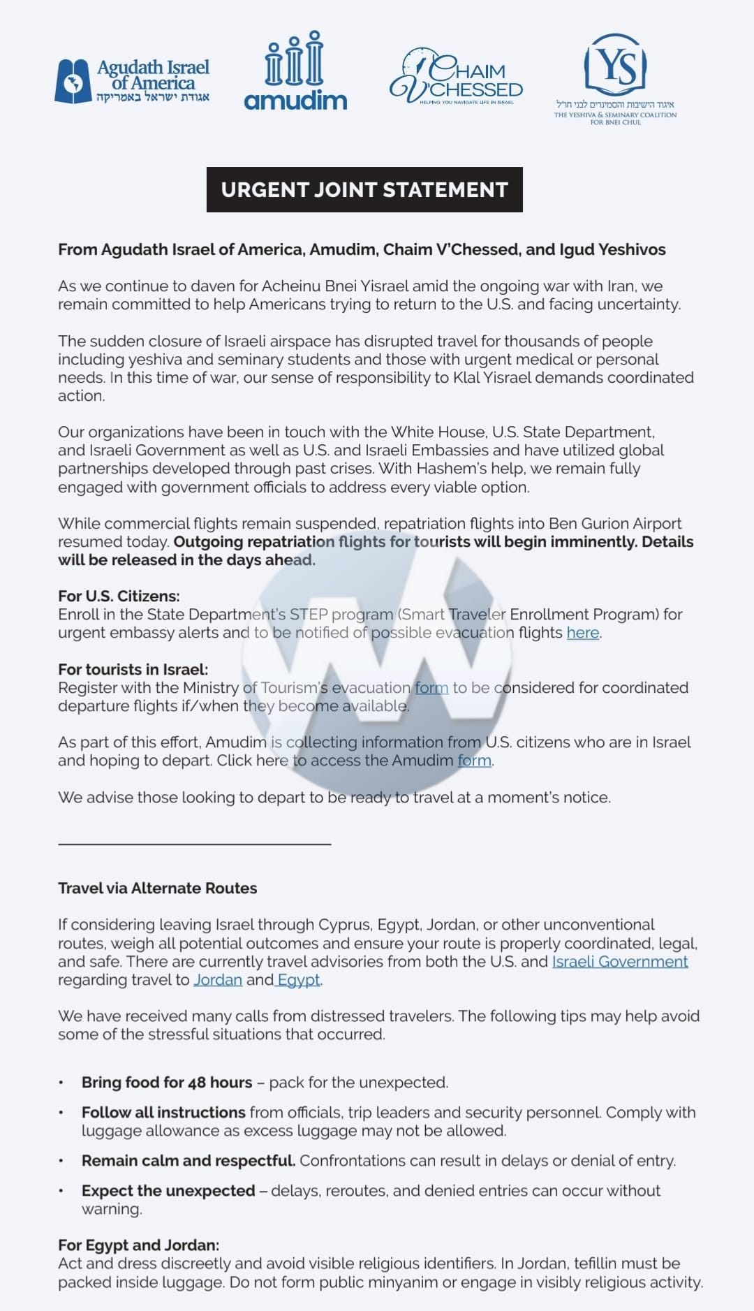 URGENT TRAVEL STATEMENT: Agudath Israel of America, Amudim, Chaim V’Chessed, Igud Yeshivas