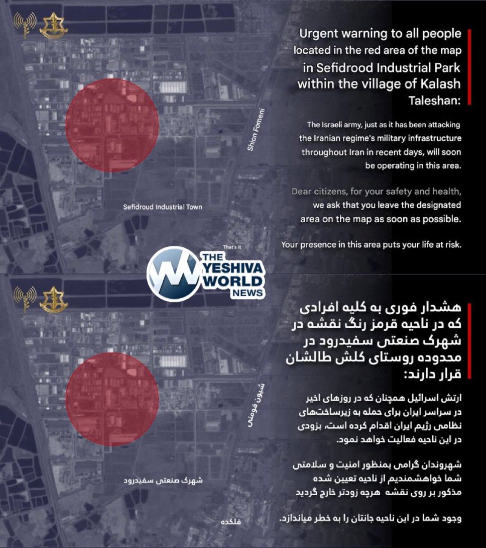 The IDF has just released a statement in Arabic and Farsi, ordering the immediate evacuation of all employees and residents living around the Sefidrood Industrial Park in the village of Kolesh Taleshan, near the Northwestern Iranian city of Rasht.