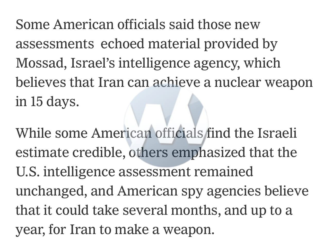 NY TIMES REPORT: Some U.S. officials say new assessments echo Mossad’s claim that Iran could build a nuclear weapon in 15 days. While some find this credible, others note that U.S. intelligence still believes it would take several months to a year.