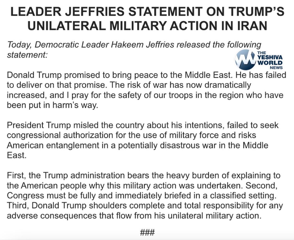 Democratic leader Hakeem Jeffries releases statement on Trump launching U.S. strikes on Iranian nuclear facilities.