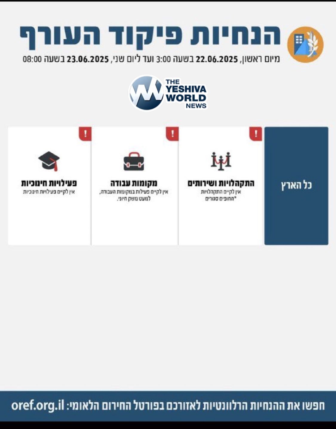 The IDF Homefront Command has raised restrictions for civilians across the country to their highest-level.