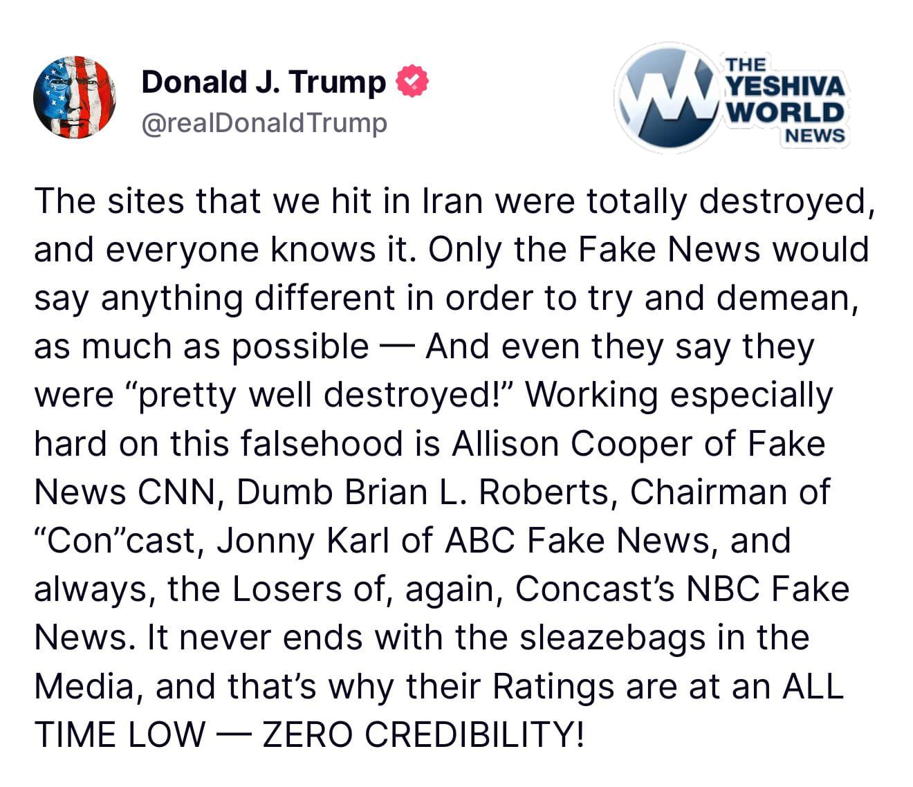 JUST IN: President Trump SLAMS reports that the U.S. did not totally destroy the Iranian nuclear sites. “It never ends with the sleazebags in the media.”