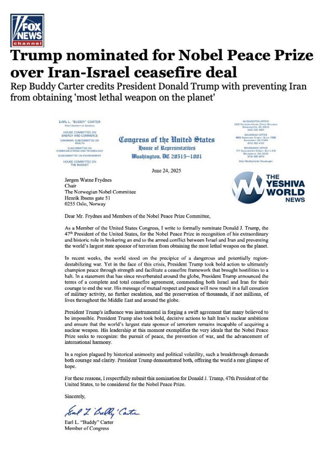 Rep. Buddy Carter has nominated President Trump for the Nobel Peace Prize following the Iran-Israel ceasefire agreement.