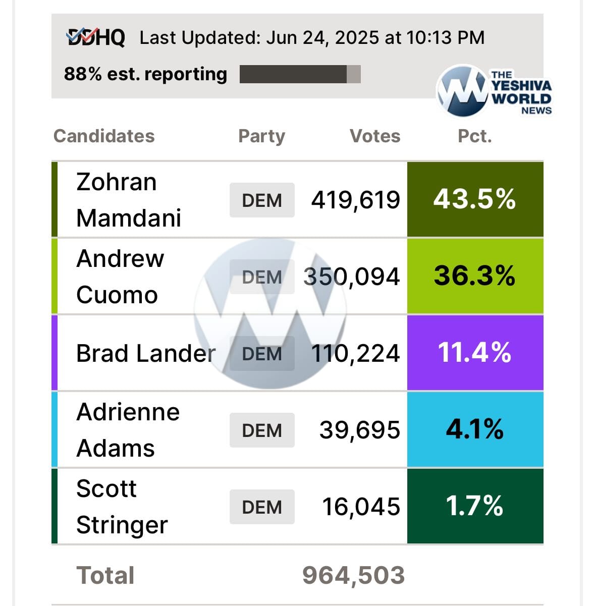 🚨 YWN UPDATE ON NYC DEMOCRAT MAYORAL PRIMARY: Anti-Israel socialist Zohran Mamdani is projected to have won ahead the first round of the Democratic primary for New York City mayor. But he’s not the nominee yet.