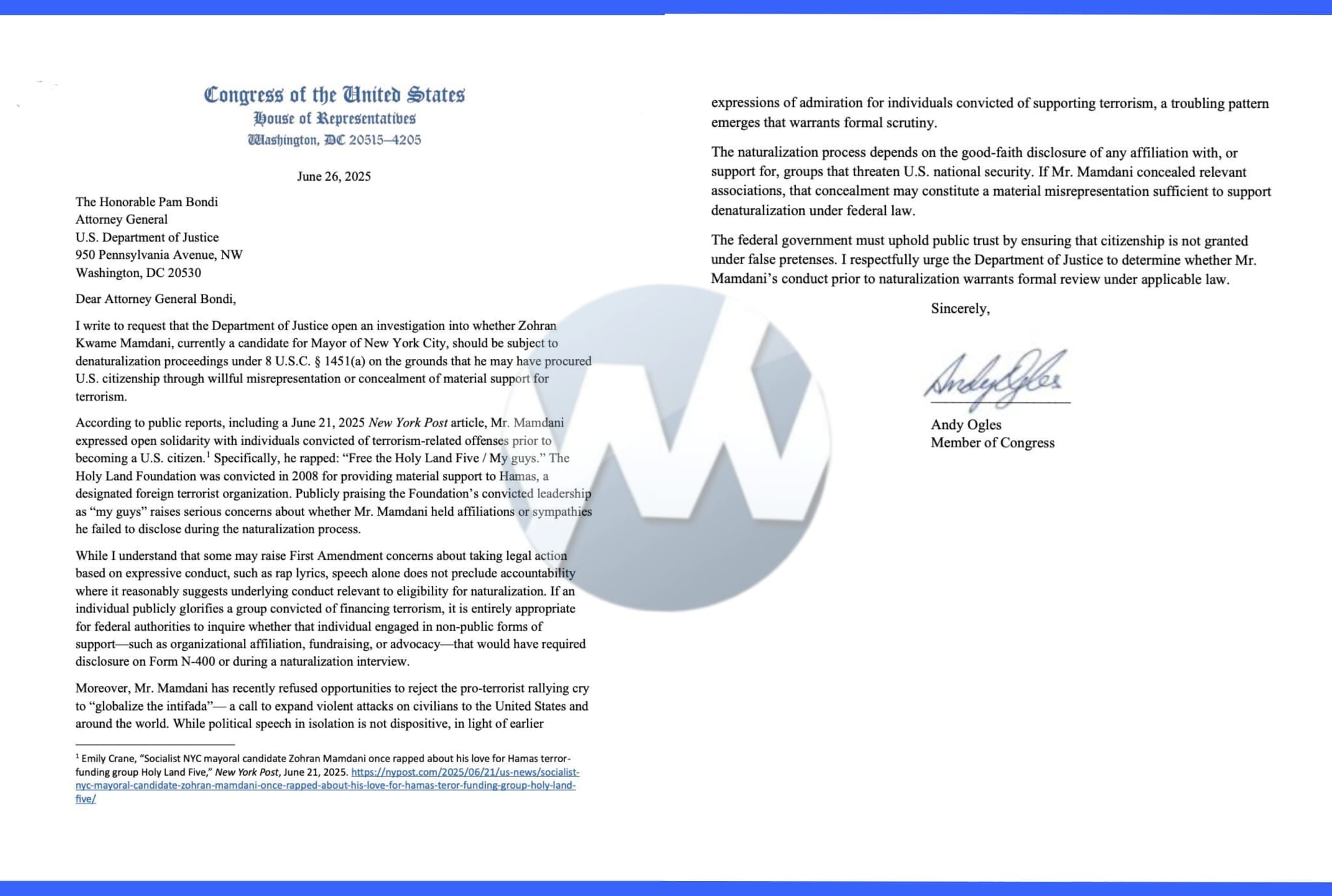 Rep. Andy Ogles calls on AG Pam Bondi to launch denaturalization proceedings against Communist Zohran Mamdani and deport him: