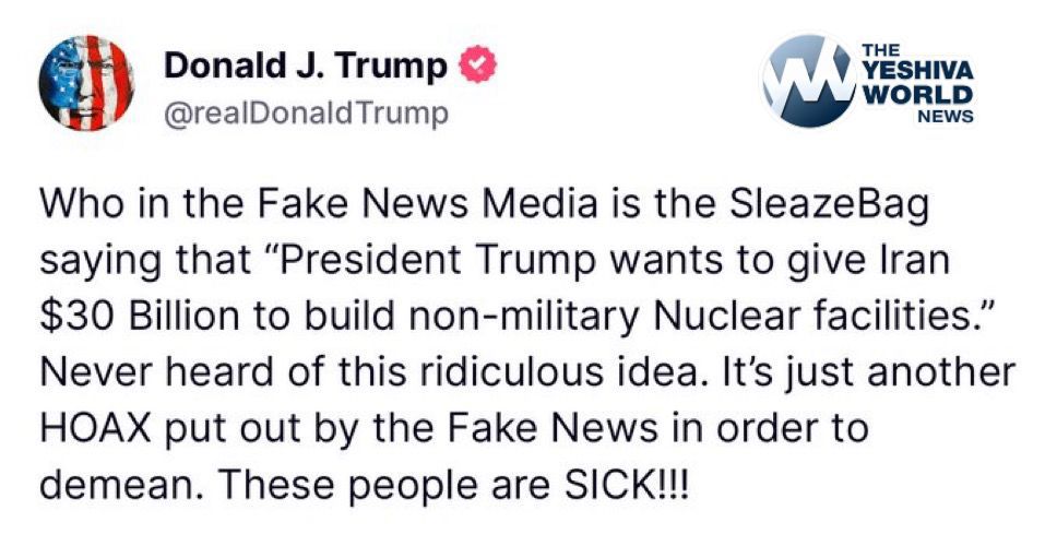 President Trump denied claims by the “Fake News Media” that he wants to give Iran $30 billion to build non-military nuclear facilities, calling it a “ridiculous idea” and a “HOAX” intended to demean him. He labeled the media “SICK!!!”.