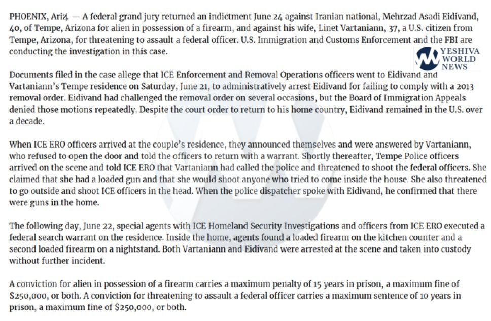 An Iranian national & his wife have been federally indicted after she allegedly threatened to shoot ICE officers in Arizona.