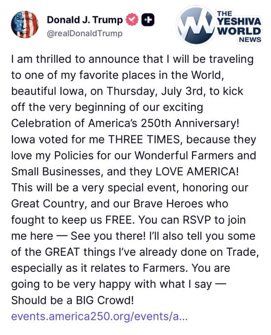 JUST IN: Trump announces Iowa event Thursday “to kick off the very beginning of our exciting Celebration of America’s 250th Anniversary…”
