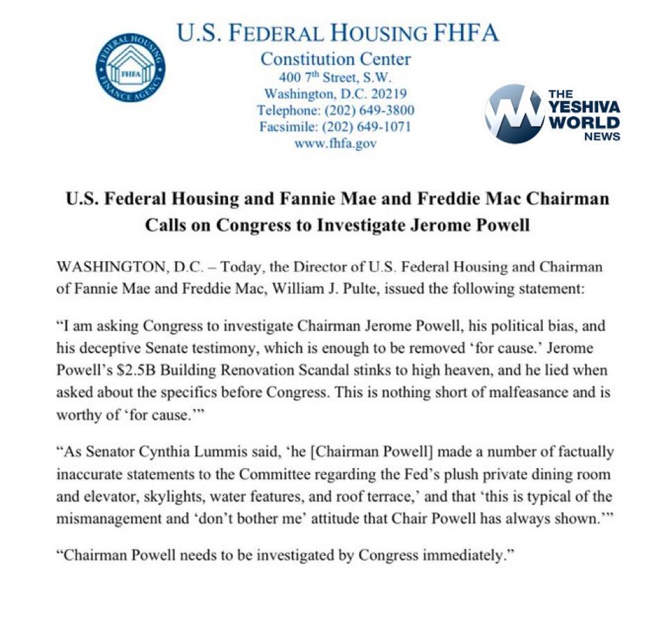 U.S. Federal Housing and the Fannie Mae and Freddie Mac Chairman Calls on Congress to Investigate Jerome Powell.