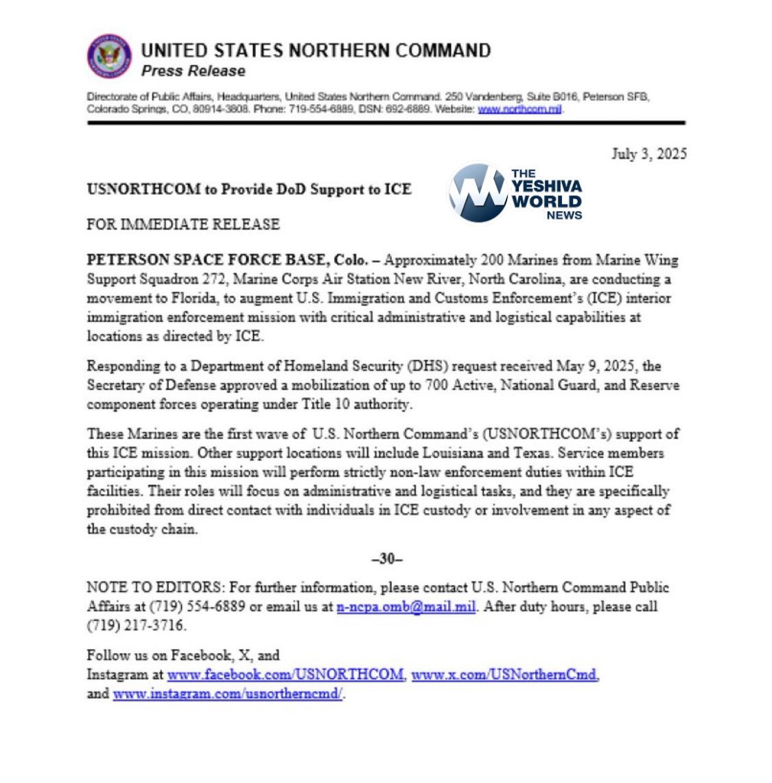 The Department of Defense is deploying 200 U.S. Marines to Florida to support ICE operations.