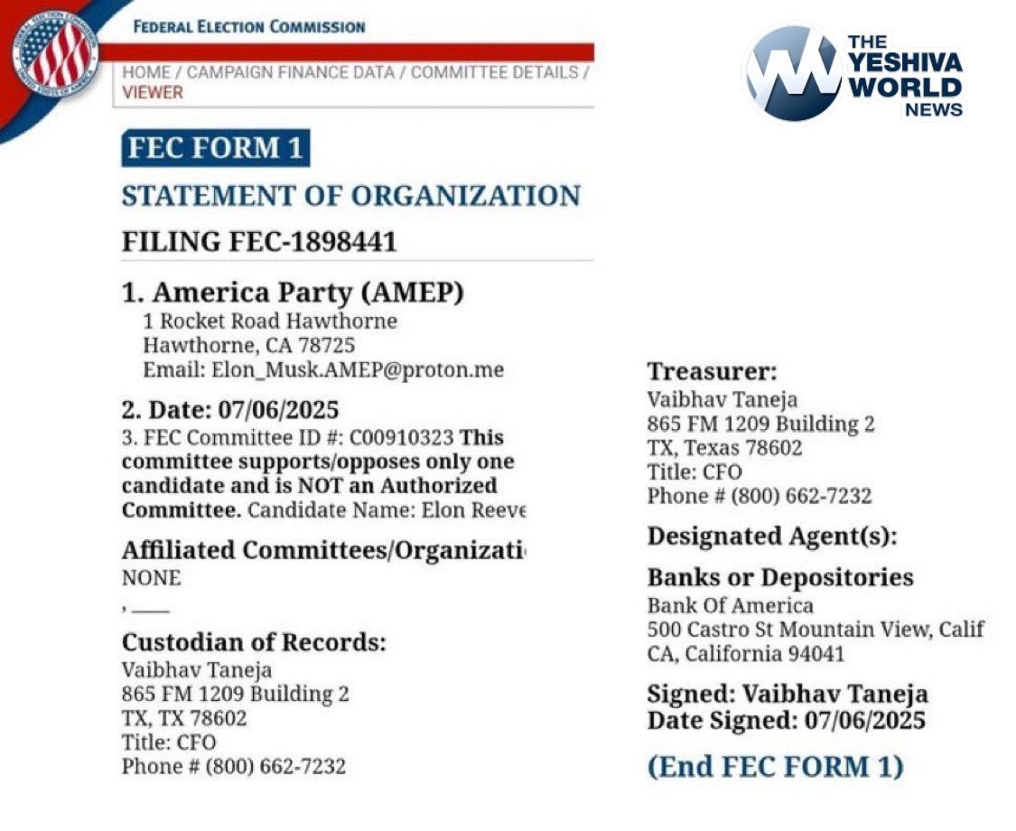 BREAKING: A recently uncovered FEC filing reveals the establishment of the America Party (AMEP) linked to Elon Musk’s name, with Vaibhav Taneja named as both the Custodian of Records and Treasurer.