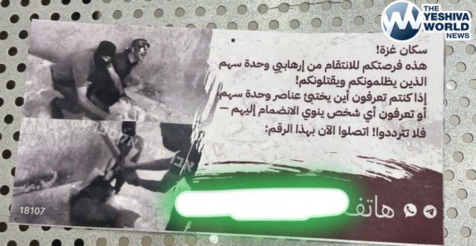 Palestinians report that IDF leaflets distributed over Nuseirat provide Gazans an opportunity to retaliate against members of Hamas’ Saham Unit, by informing on them via a phone number.
