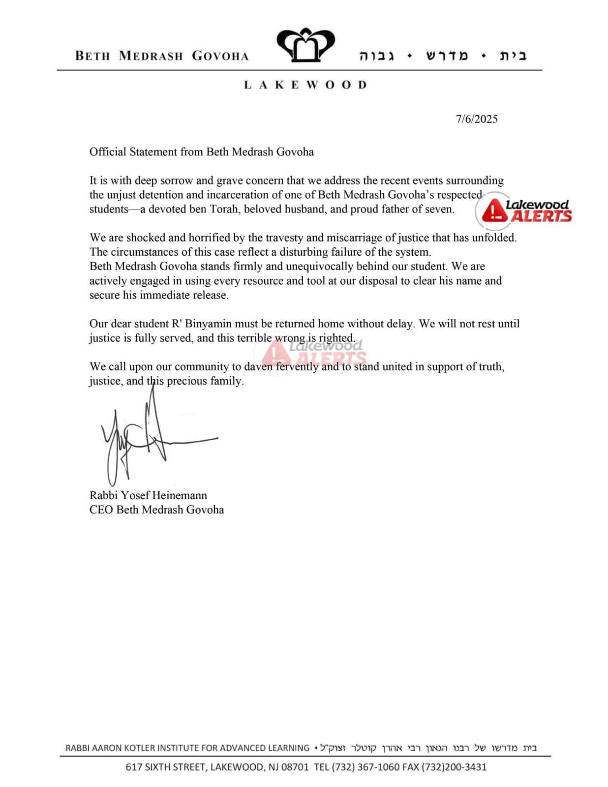 BMG CEO Rabbi Yosef Heinemann releases a statement expressing the yeshiva’s “deep sorrow and grave concern” over the arrest of yungerman R’ Binyomin Kubani.