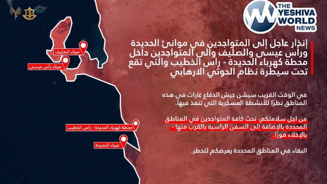 The IDF has issued urgent evacuation warnings to three ports in western Yemen – Hodeidah, Ras Issa, and Salif – as well as the Ras Al-Khatib power station in Hodeidah, saying it will soon launch strikes “targeting military activities in these areas.”