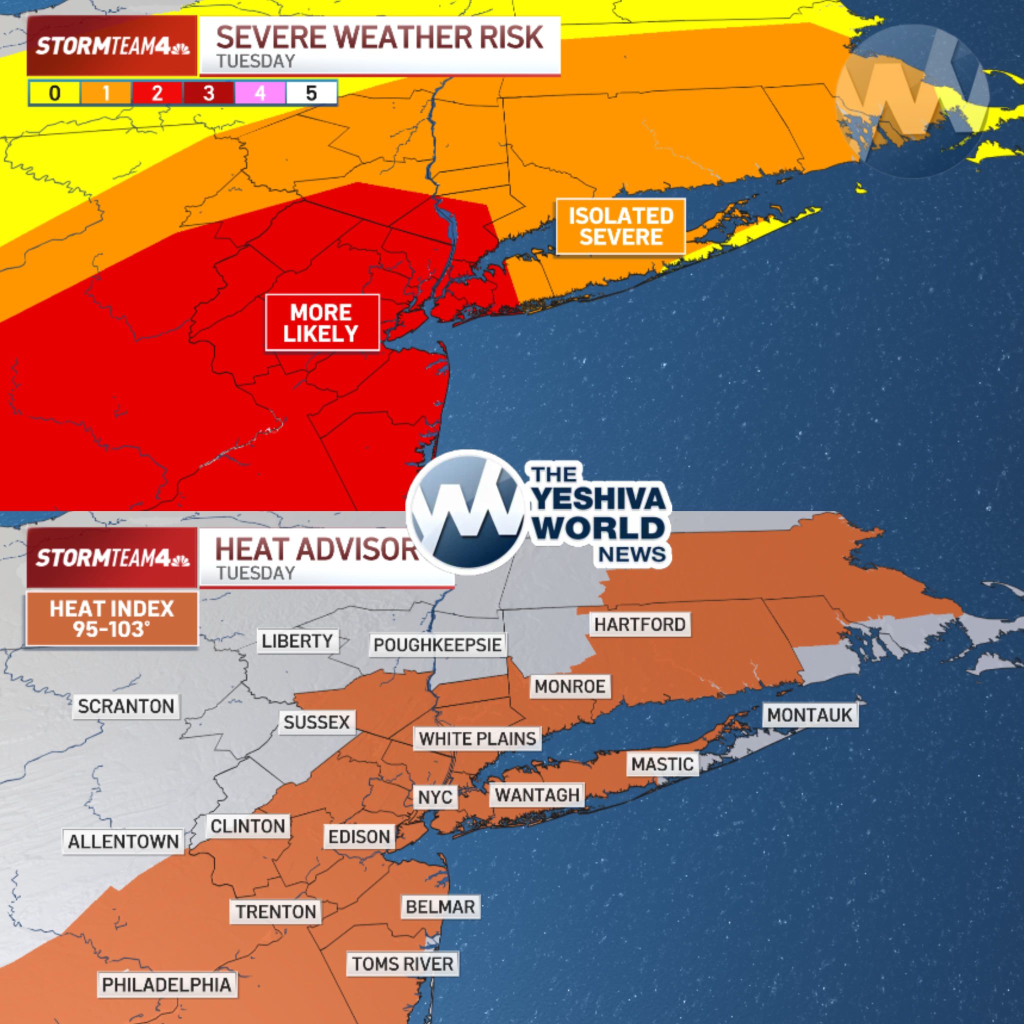 NYC WEATHER ALERT: Potentially severe thunderstorms are expected to develop across the area later Tuesday, threatening intense winds and flooding rains that have already prompted National Weather Service alerts. Tuesday is a scorcher during the day, as Temps will rise in the low 90s in the city, but we’ll see heat indices into the triple digits in some spots as we reach peak heating. Heat advisories are in effect across the region.