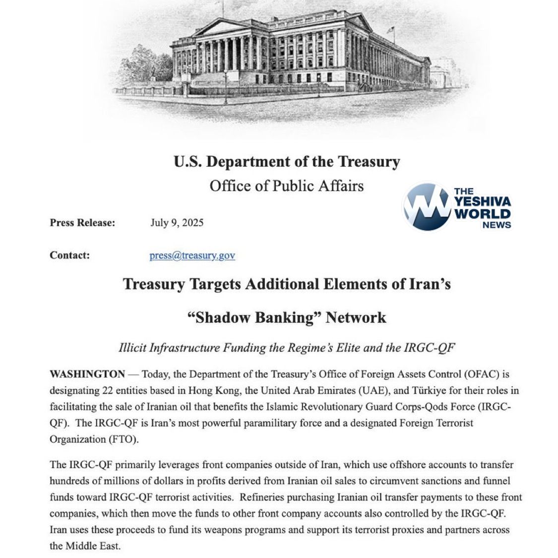 The U.S. imposed sanctions on 22 entities in Hong Kong, the UAE, and Türkiye for facilitating Iranian oil sales, which fund the Islamic Revolutionary Guard Corps Qods Force, a designated Foreign Terrorist Organization and Iran’s primary paramilitary unit.