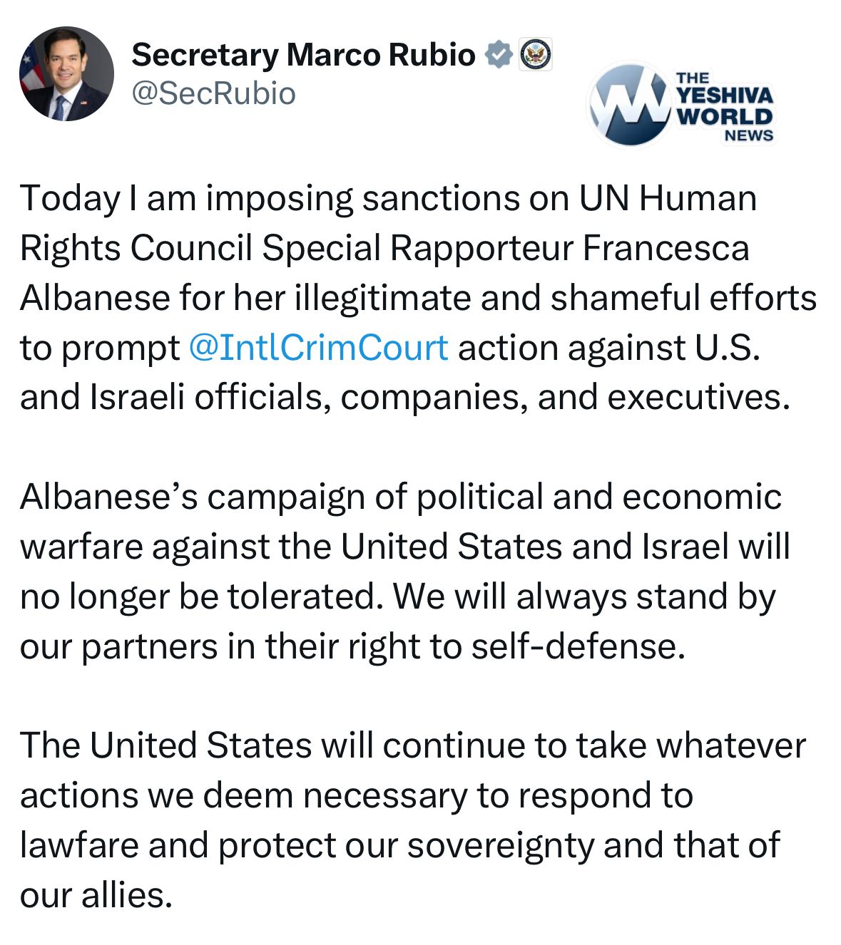 U.S. Secretary of State Rubio imposes sanctions on UN Special Rapporteur Francesca Albanese for her “illegitimate and shameful efforts to prompt ICC action against U.S. and Israeli officials, companies, and executives.”