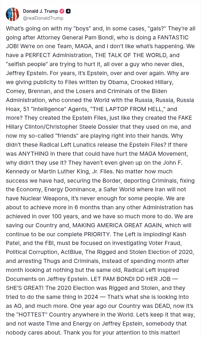 President Trump lashes out at supporters who continue to demand the release of files related to infamous predator Jeffrey Epstein, insists those that exist were fabricated by Democrats.