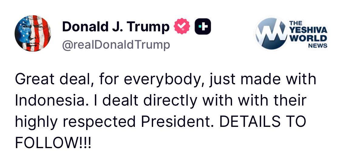 President Trump announces deal with Indonesia with details to follow.