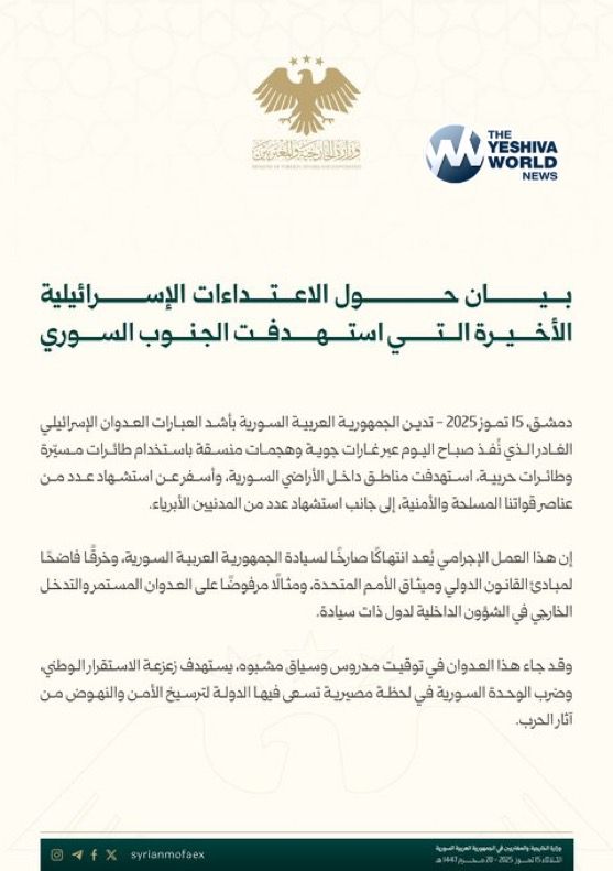 The Syrian Foreign Ministry strongly condemned the Israeli airstrikes carried out earlier today, calling them a “treacherous act of aggression” and a “clear violation of Syrian sovereignty.”
