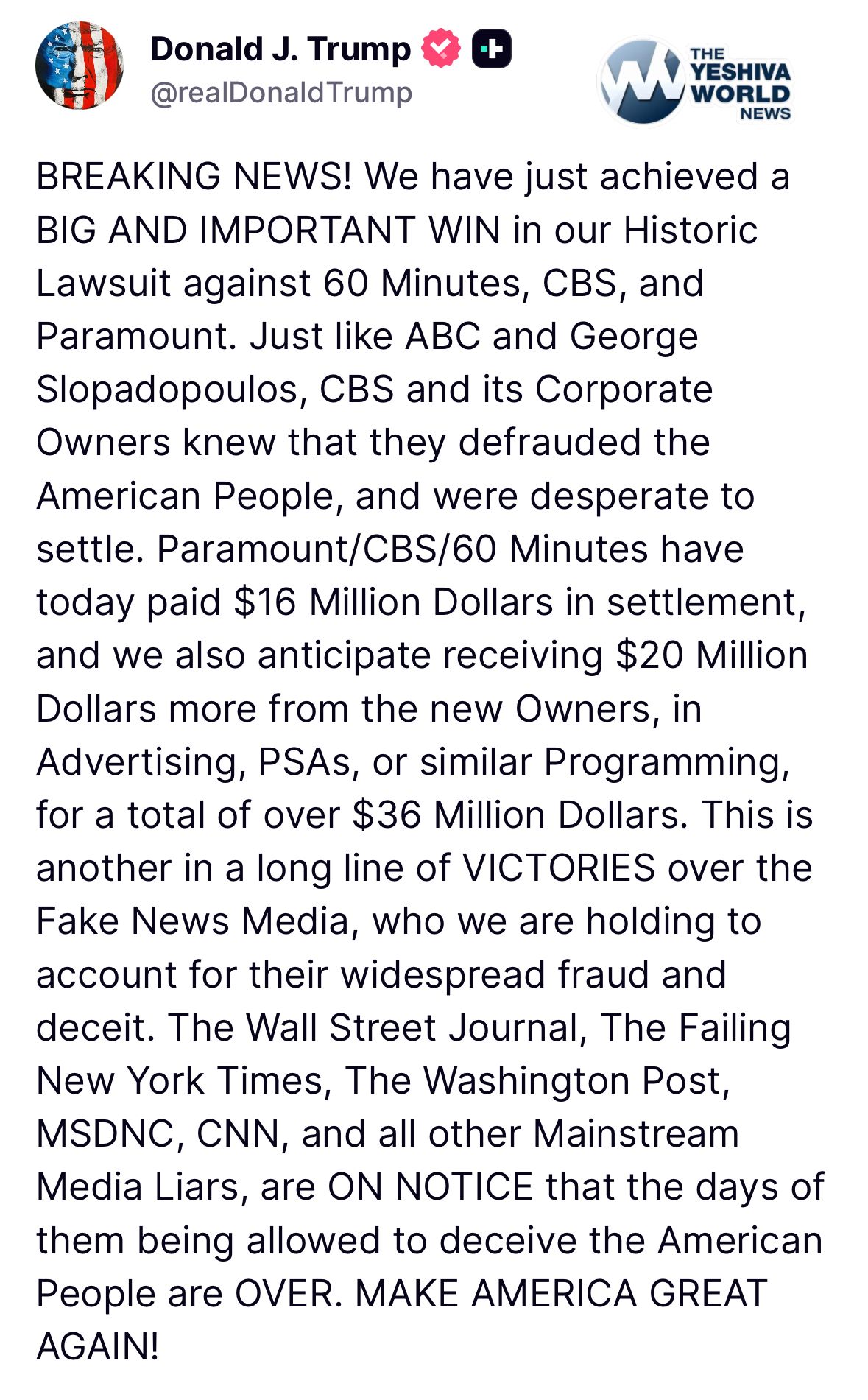 BREAKING: President Trump wins his “60 Minutes” lawsuit, Paramount settles for $16 million. $20 million more is expected from the new owners for a total of $36 million.