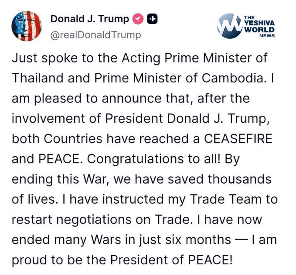 Trump posts about the deal between Thailand and Cambodia.