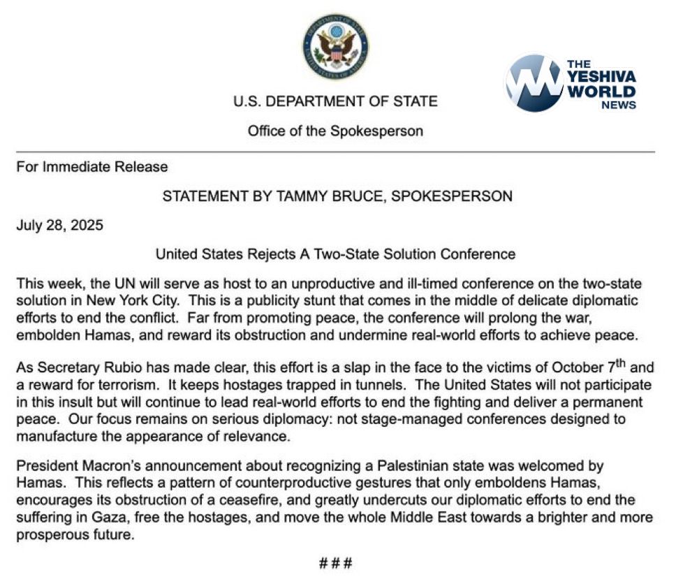 U.S. rejects UN conference on a two-state solution, calling it a stunt that emboldens Hamas, according to the State Department. Secretary Rubio says it rewards terrorism and undermines peace efforts.