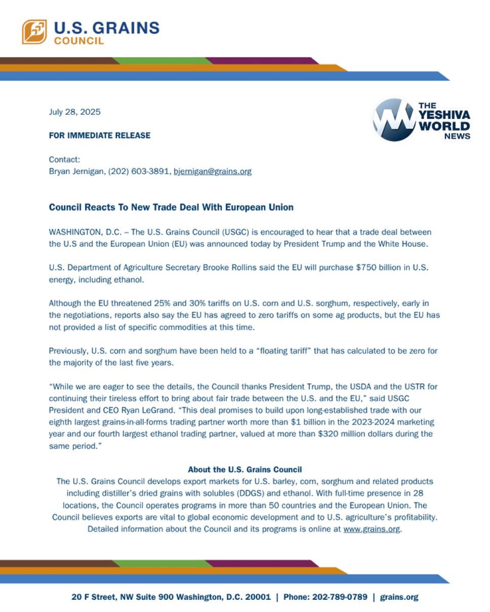 The U.S. Grains Council (USGC) welcomed today’s announcement by President Trump and the White House of a trade deal between the United States and the European Union.