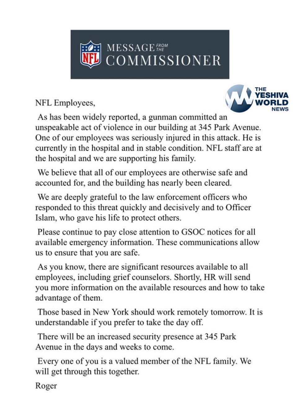 NFL Commissioner Roger Goodell sent the following message to all league employees in response to last night’s shooting.