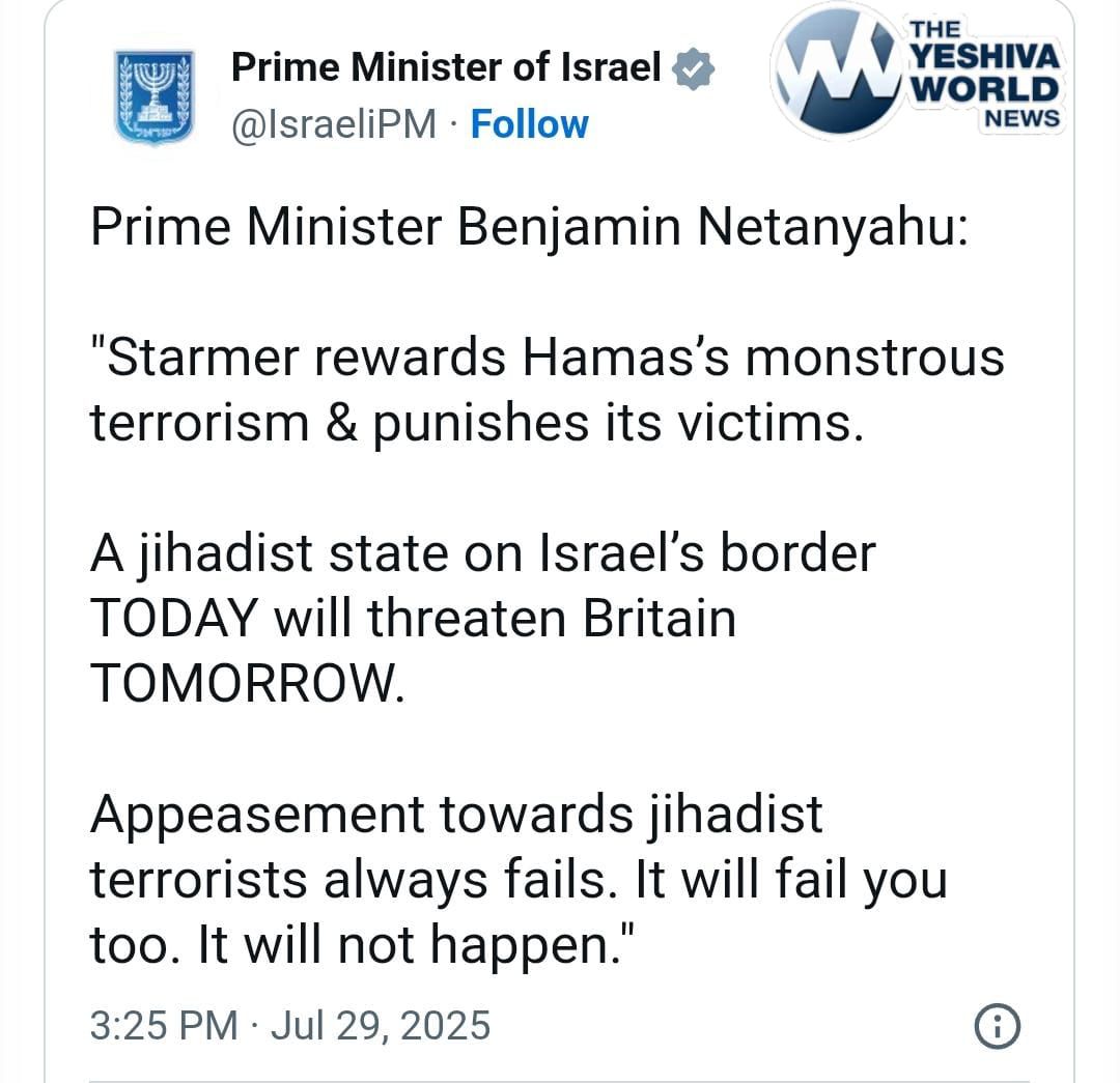 PM Netanyahu blasts his British counterpart Keir Starmer for announcing conditional plans to recognize a Palestinian state, saying that it “rewards Hamas’s monstrous terrorism and punishes its victims.”