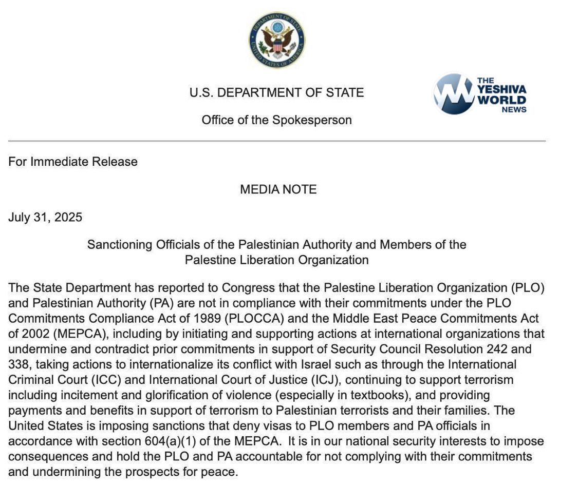 The U.S. State Department has announced visa sanctions against officials from the PLO and Palestinian Authority, citing national security concerns and accusing them of failing to meet commitments and undermining peace efforts.