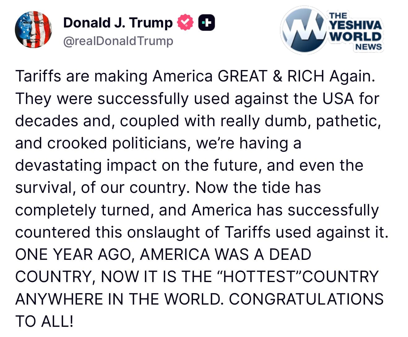 President Trump declared that tariffs are “making America GREAT & RICH again,” saying the tide has turned after years of harmful trade policies. He claimed the U.S. has gone from being “a dead country” to the “hottest country anywhere in the world.”