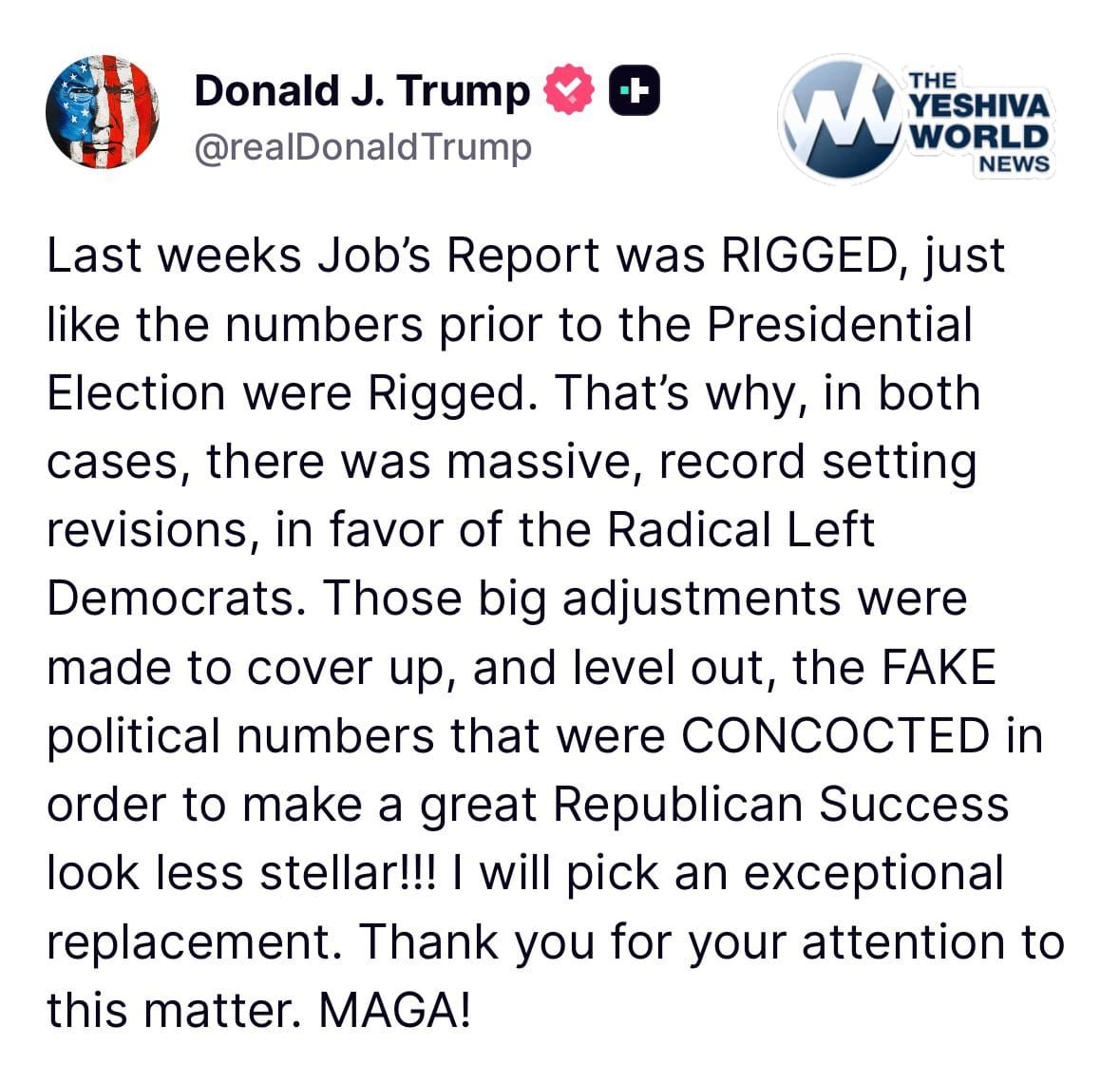 BREAKING: President Trump claims last week’s Jobs Report was “RIGGED,” alleging massive revisions favored Radical Left Democrats to downplay Republican success. Promises “exceptional replacement.”