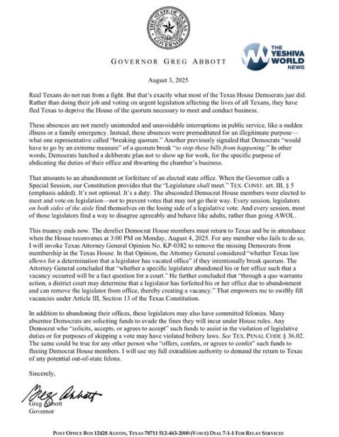 Texas Governor Greg Abbott says he will remove Democrat lawmakers who fled to Illinois to prevent a vote on restricting today and has given them until 3PM today to return. “The derelict Democrat House members must return to Texas and be in attendance when the House reconvenes at 3:00 PM on Monday, August 4, 2025.”