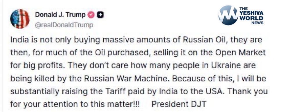 Trump says he will “substantially” raise tariffs on India in response to the country’s continued large-scale purchases of Russian oil.