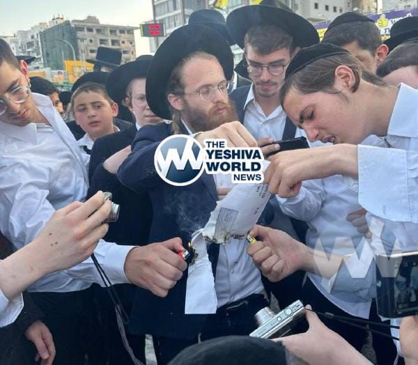 Chareidi protestors burn an IDF draft notice at one of the many Hafganos taking place.