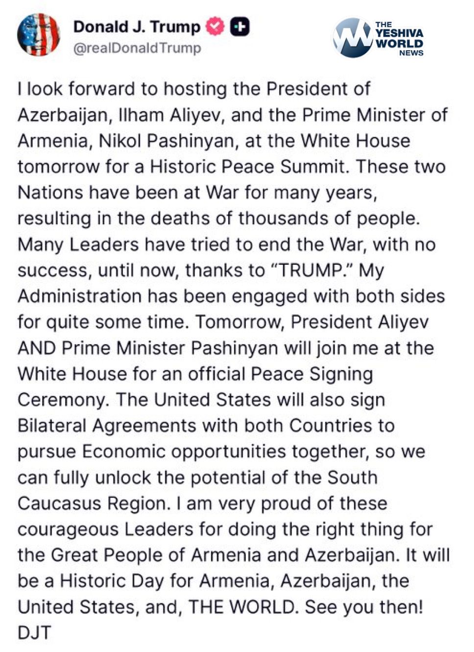 POTUS: “I look forward to hosting the President of Azerbaijan, Ilham Aliyev, and the Prime Minister of Armenia, Nikol Pashinyan, at the White House tomorrow for a Historic Peace Summit.”