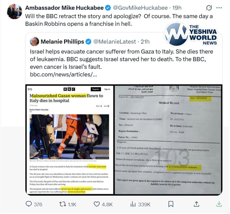 US Ambassador to Israel Mike Huckabee on Sunday ridiculed the BBC for once again publishing a false and distorted story about Gaza in order to portray Israel as a villain rather than Hamas.