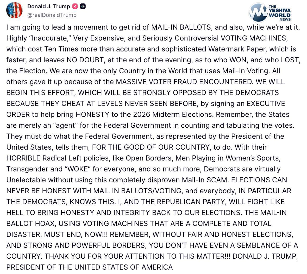 🚨 BREAKING: President Trump says he is going to lead an effort to get rid of mail in ballots and electronic voting machines.