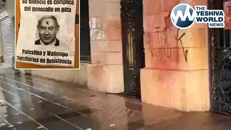 Bicur Joilim (Bikur Cholim), the oldest shul in Santiago, Chile, was vandalized on Friday while mispallelim were still inside, as three masked vandals spray-painted anti-Israel graffiti, splashed red paint, and hung posters depicting Netanyahu with a bullet hole in his head and messages accusing Jews of complicity in “genocide.” The Jewish community noted this was the fourth such attack on the shul since the October 7 massacre.