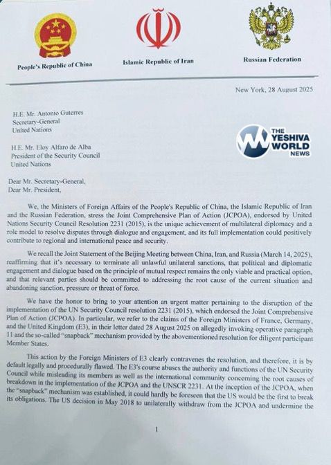 Iran, Russia, and China have signed a joint letter rejecting the EU’s snapback sanctions on Tehran, calling them illegal and politically harmful.