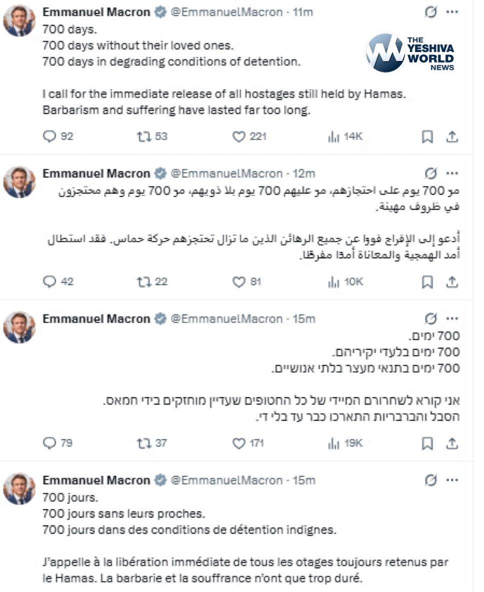 French President Emmanuel Macron expressed grief over Israeli hostages in four different languages following reports that PM Bibi Netanyahu blocked his visit to Israel.