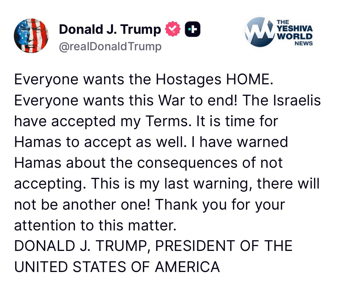 🚨🚨🚨 BREAKING: United States President Trump issues a final ultimatum for Hamas. Release all the hostages or else.