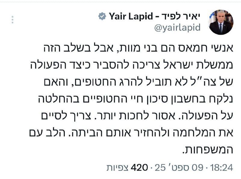 After initially praising the attack on Hamas leadership, Israeli opposition leader Yair Lapid now asks: “Was the risk to the hostages’ lives taken into account in the decision on the operation?”