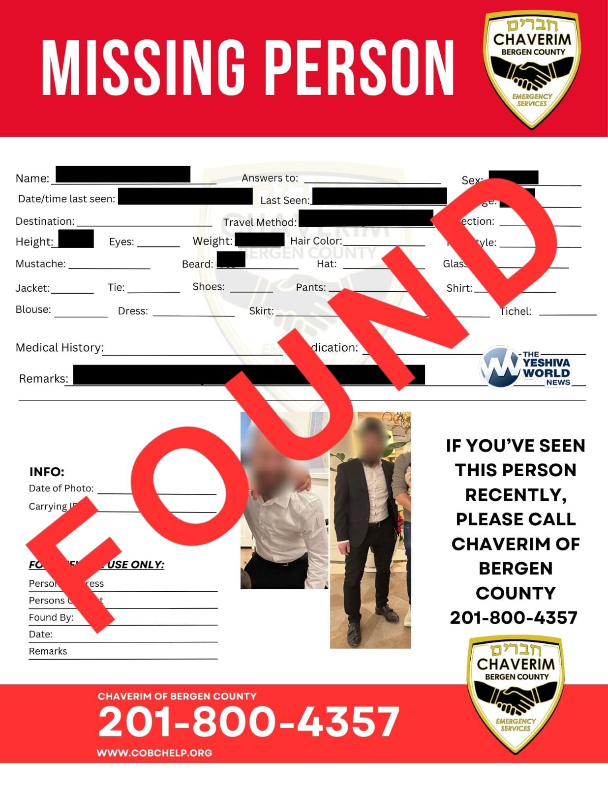 Chaverim of Bergen County reports that the missing individual that was last seen in Fair Lawn on Monday, September 8th, has been located safely.