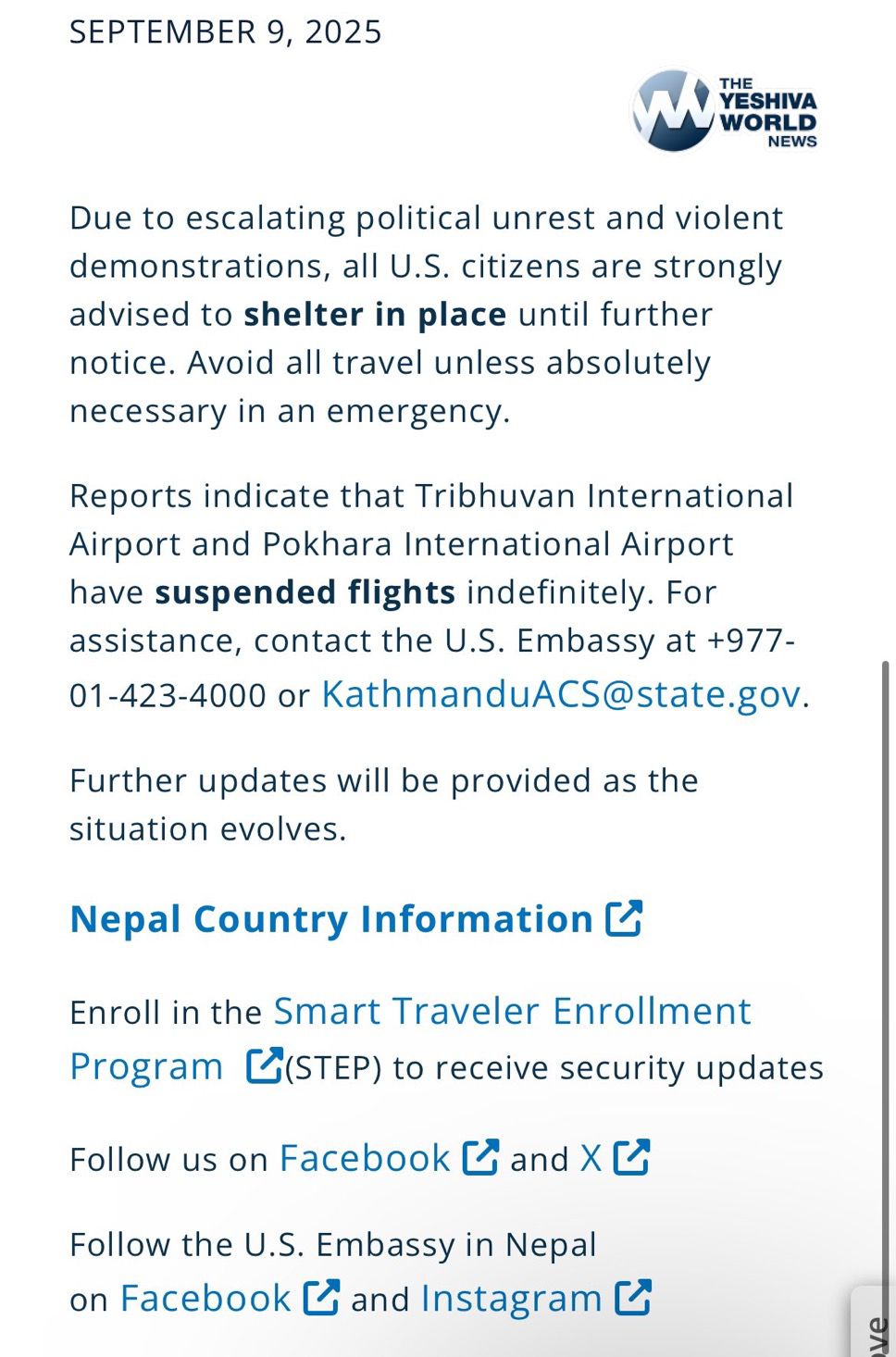 The U.S. Embassy in Nepal urges American citizens to shelter in place amid ongoing deadly protests, while Tribhuvan and Pokhara International Airports have indefinitely suspended all flights.