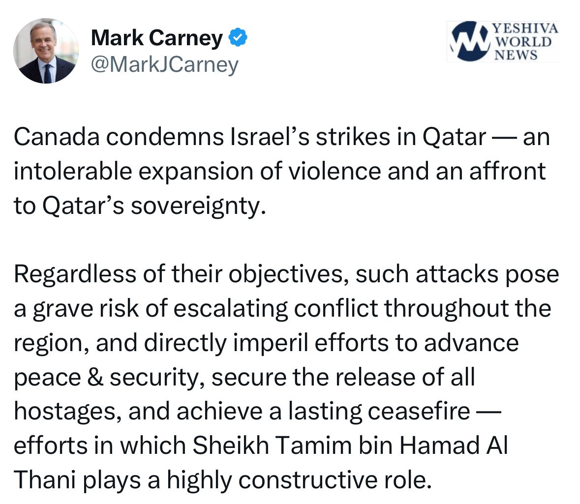 Canadian Prime Minister, Mark Carney puts out a statement condemning the Israeli strikes on Hamas targets in Qatar.
