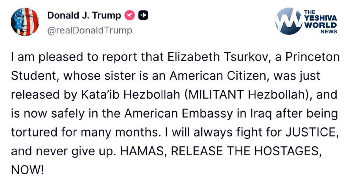President Trump has successfully secured the release of Elizabeth Tsurkov, a Princeton student held by Hezbollah, whose sister is an American citizen. “She is now safe at the U.S. Embassy in Iraq after enduring months of torture. I will always fight for justice and never give up. HAMAS, RELEASE THE HOSTAGES NOW!”