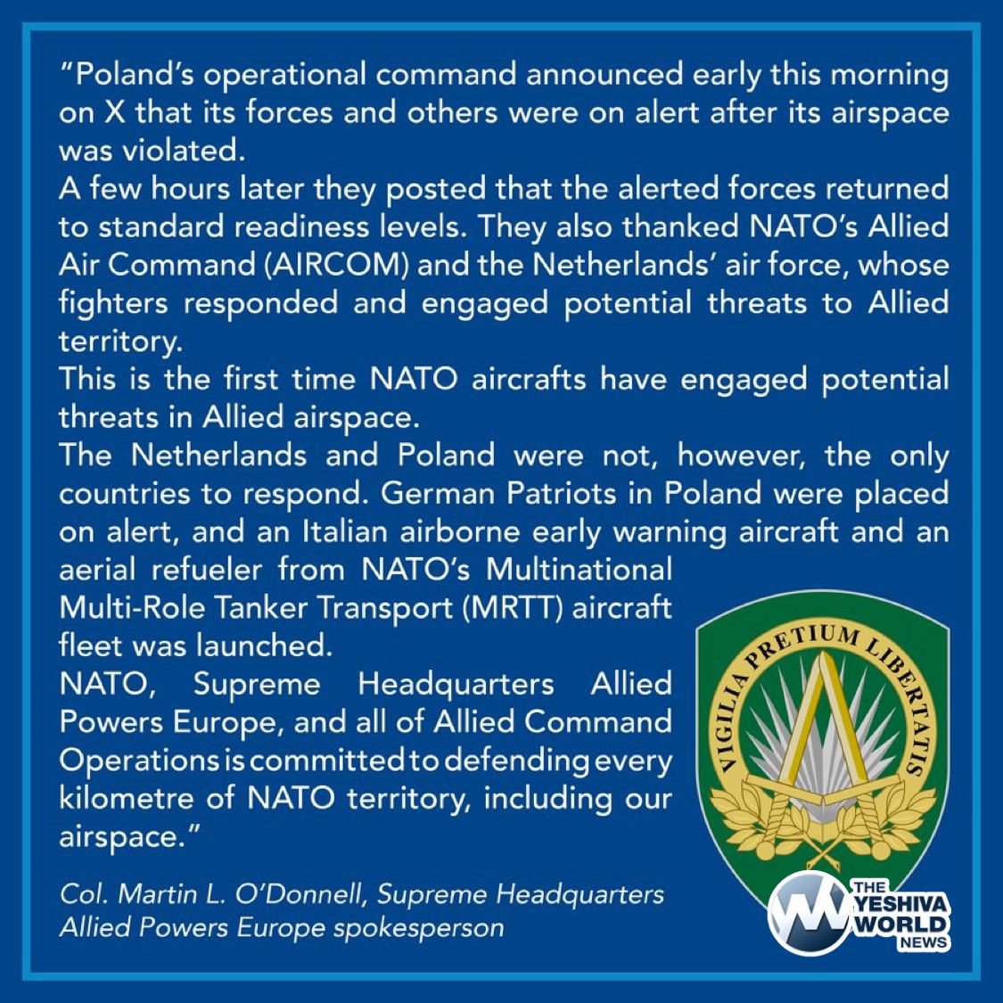 NATO’s SHAPE spokesperson, Col. Martin L. O’Donnell, said last night’s Russian drone intrusion into Poland marked the first time NATO aircraft engaged potential threats in Allied airspace, with German Patriots on alert and Italian MRTT aircraft deployed.
